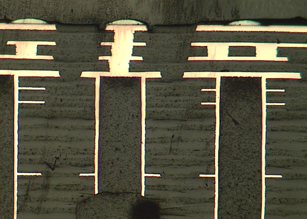 C’est le cas des circuits imprimés de type HDI. Ici, les microvias peuvent être du type via-in-pad pour l’assemblage de composants, décalés ou empilés, puis remplis de résines non conductrices - remplissage de résine - et recouverts de cuivre sur le dessus, ou remplis de cuivre - remplissage de cuivre - et recouverts de cuivre pour obtenir des vias remplis avec cuivre de couverture.